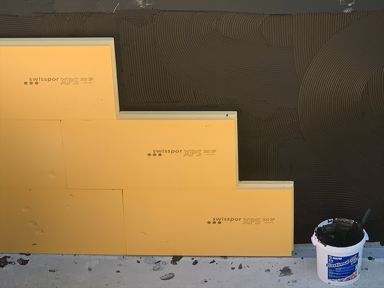 Da diese Dämmungen wasser- und druckbeständig sein müssen, werden hauptsächlich extrudierte Polystyrol-Hartschaumplatten oder Schaumglasplatten verwendet. Bei Bauten im stehenden Grundwasser müssen die Dämmungen mit einem geeigneten Kleber vollflächig mit dem Untergrund verklebt werden.